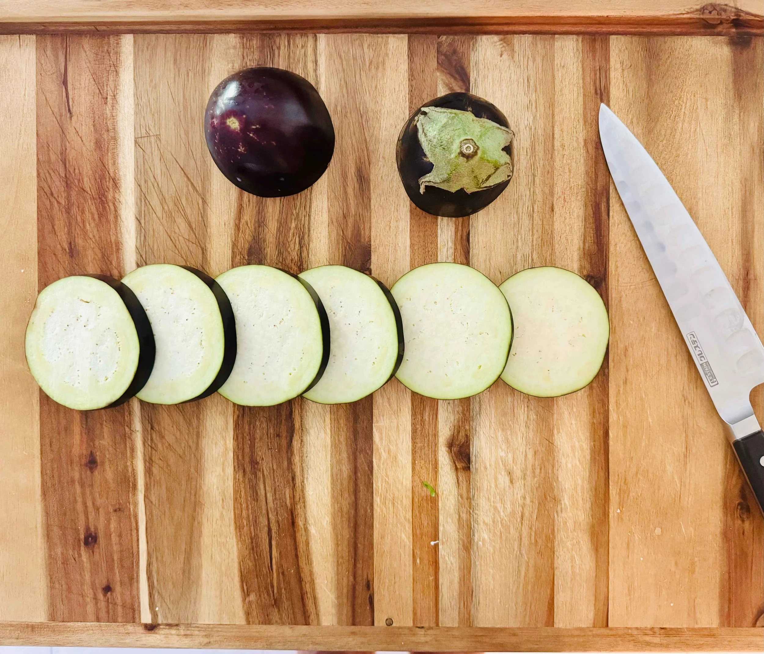 - Select a part of the eggplant that has an even size. Cut six rounds that are about 1/2-inch thick from this part. Make sure the slices are similar in size so they stack well on top of each other. Discard what's left of the eggplant.