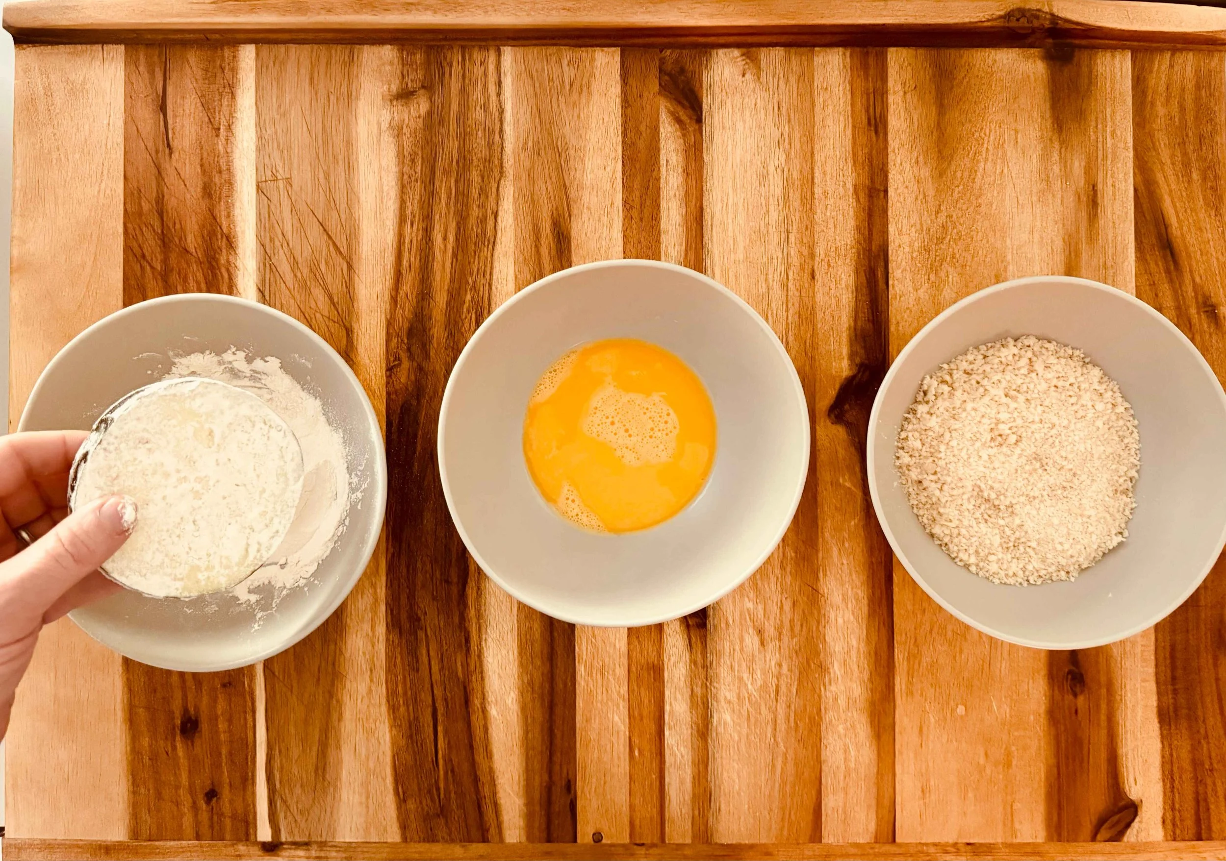 Place all-purpose flour in one bowl, beaten egg in another, and panko breadcrumbs in the third bowl.