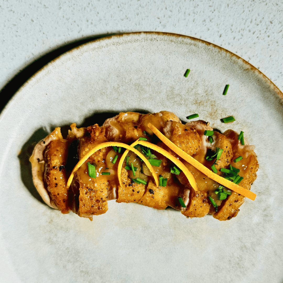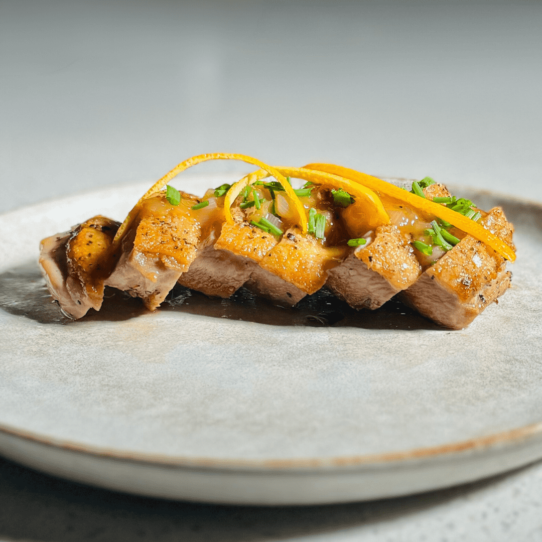 - Serve the sliced duck with the skin side up. Drizzle the duck with the prepared sauce and garnish with strips of orange zest and chopped chives.
